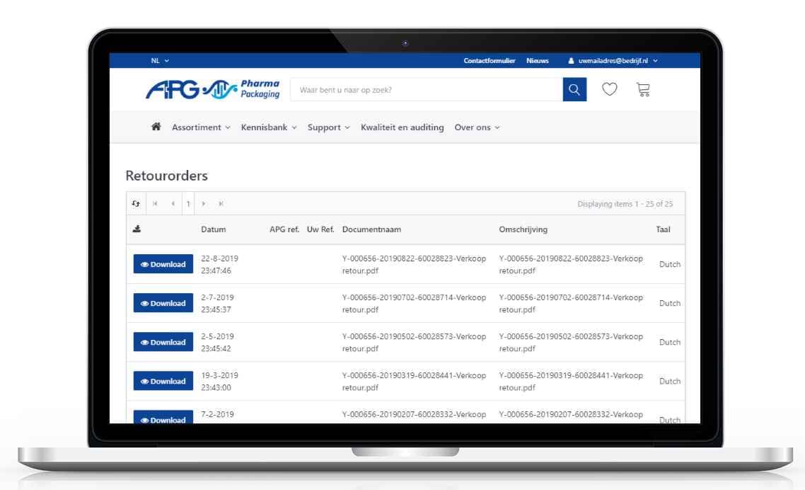 • Download uw offertes, orderbevestigingen, facturen, retourorders en creditfacturen