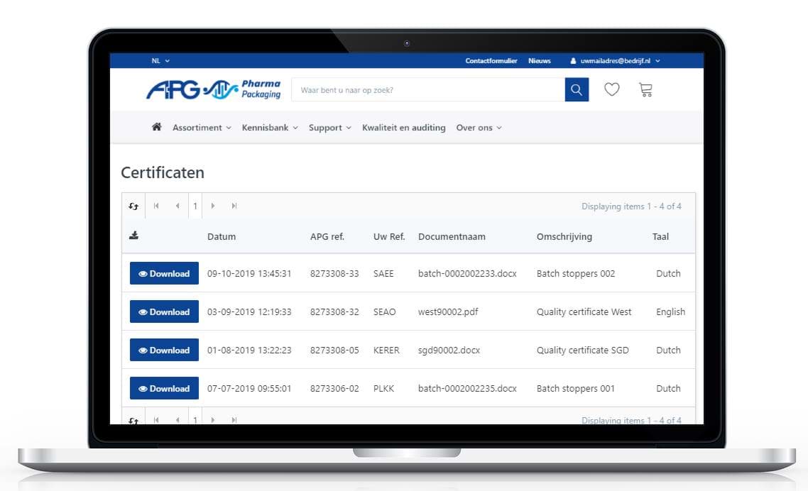Compliancy is key. APG verzorgd toesturen van verschillende certificaten, waaronder KwaliteitManagement Systeem certificaten en product gerelateerde certificaten zoals analyse- en conformiteitscertificaten. Uw certificaten zijn vindbaar onder 'Certificaten' binnen de module Kwaliteit & Docs. Elk certificaat beschikt over de volgende extra gegevens: